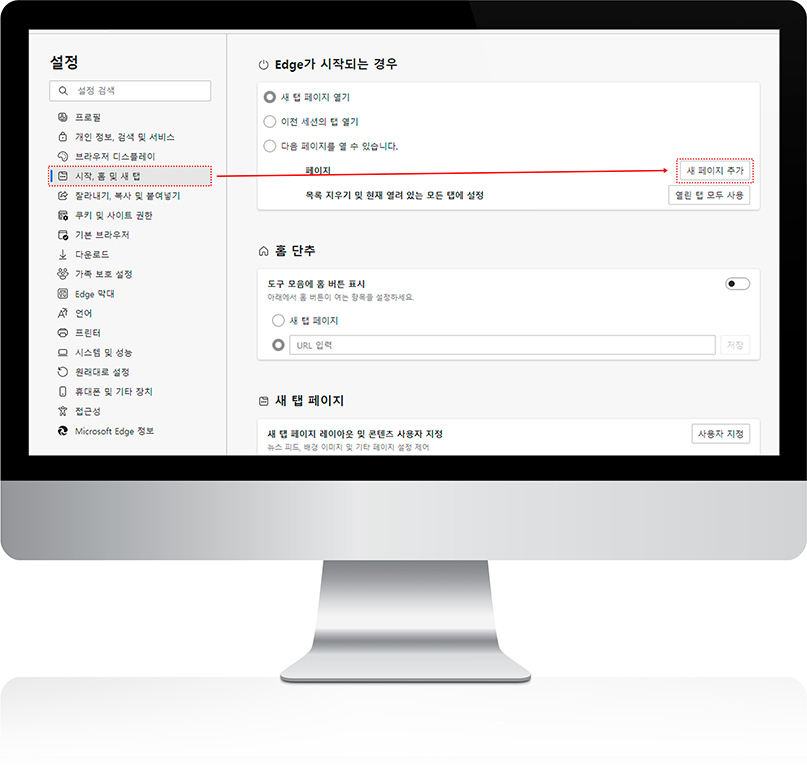 인터넷 옵션 변경으로 시작페이지를 설정할 수 있습니다.