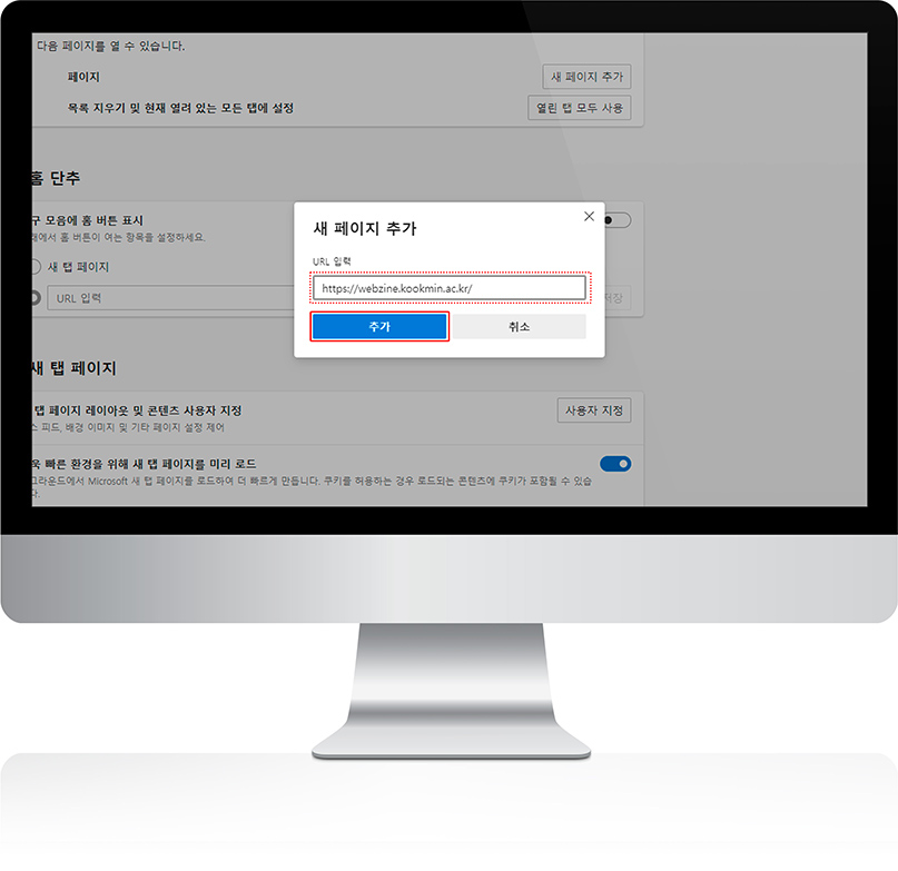 5. 새 페이지 추가 창에서 https://webzine.kookmin.ac.kr/ 를 입력 합니다.