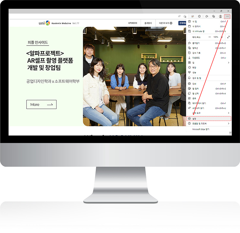 7. 인터넷 Edge를 새로 띄어보면, 국민대 웹진으로 시작 페이지가 설정된 것을 확인하실 수 있습니다.