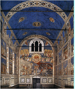 무엇보다도 이 예배당은 단테와 동시대 화가였던 지오토의 프레스코 벽화로 주목받는다. 성모 마리아와 예수의 생애에 관한 이야기들이 인간의 감정을 솔직하게 담은 정제된 공간 안에서 라피스 라줄리의 푸른색으로 칠해진 하늘을 배경으로 하여 다채롭게 펼쳐진다. 별이 박힌 하늘과 같은 푸른 천장과 본당의 네 벽을 덮은 지오토의 벽화는 인물의 감정과 인체의 사실적인 표현, 공간 착시의 회화적인 전략이 구현되는 르네상스 양식의 시작을 알렸다. (도4)