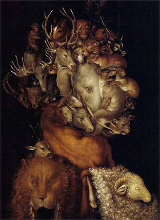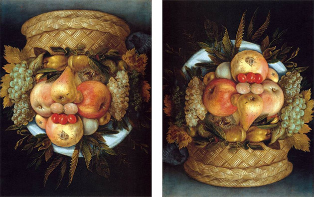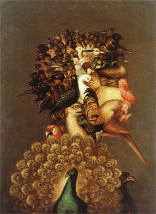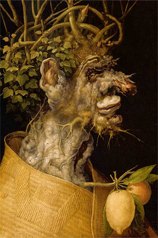 주세페 아르침볼도(Giuseppe Arcimboldo 혹은 Arcimboldi, 1527-1593)는 열매, 꽃, 나뭇잎, 동물, 새, 물고기, 책, 사물 등의 이미지를 조합하여 그리는 독특한 기법의 화풍인 ‘복합 초상화(composite heads)’로 유명하다. 그의 작업은 자연의 기이함이나 수수께끼에 매료되었던 후기 르네상스 혹은 매너리즘(mannerism)의 경향을 보여주기도 한다. 식물학과 동물학에 기초하여 다양한 생물의 형태를 세밀하게 묘사하고 창의적으로 조합하여 수수께끼가 가득한 환상적인 구성을 보여준 그의 초상화는 지금 보아도 눈을 떼기가 힘들다. 숨은그림찾기와 같이 절묘하게 사물들을 배열한 그의 작품 중에는 위아래를 뒤집어서 볼 때 다른 형상이 나타나는 것들도 있어 보는 사람의 호기심을 불러일으킨다. [도 1]