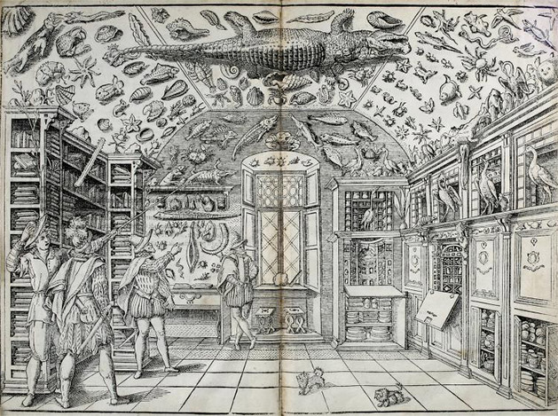 도2. Ferrante Imperato, Cabinet of Curiosities in Dell' Historia Naturale, 1559, fold out woodcut print, c. 33.7 × 23.5 cm closed, Biodiversity Heritage Library, Naples, Italy.