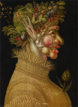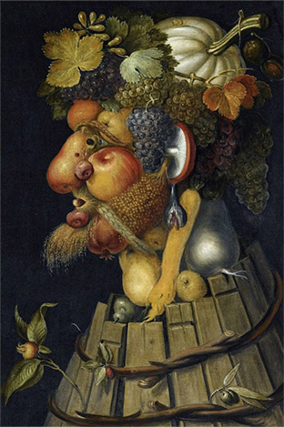 한 해의 햇빛과 비바람을 맞아가면서 꽃피고 열매 맺어 익은 열매를 추수하는 계절 가을이다. 나뭇잎들이 여러 색으로 물들고 먹음직한 색으로 익은 과일들은 가을의 정취를 더해주면서 한 해를 조용히 버티면서 결실을 이룬 힘을 보여준다. 보도에는 노란색, 붉은색 등의 낙엽이 떨어지고, 따뜻한 색깔의 둥근 과일과 야채가 풍성하게 놓여있는 상점을 자주 마주친다. 여러 형태와 색채로 화려하게 변한 계절의 변화를 보면서 가을의 얼굴은 어떤 것일까? 눈은 동그란 과일, 코는 길쭉한 채소, 입은 붉은 단풍으로 대체한 얼굴을 상상하게 되는 계절이다. 이러한 상상을 실제로 그렸던 16세기 화가의 작품을 되돌아보게 된다.