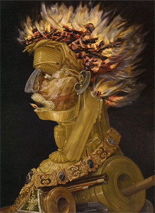 <불>은 유일하게 무기물로 구성된 초상화이다. 코와 귀는 합스부르크 제왕의 상징 중의 하나인 불꽃 점화기(fire striker)로 구성되어 있고, 목은 불이 붙은 양초, 머리털은 타고 있는 나무, 몸은 대포로 구성되었다. [도 8]