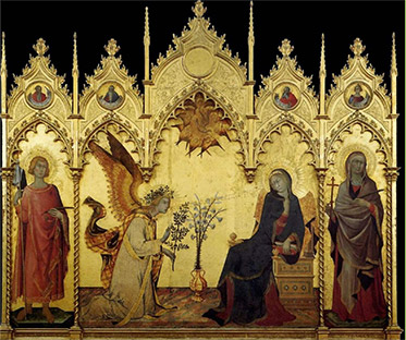 시모네 마티니(Simone Martini)와 리포 멤미(Lippo Memmi)가 그린 후기 고딕 양식의 이 작품에서는 지금 막 도착한 듯 옷자락을 휘날리고 아직 날개를 접지 못한 천사 가브리엘이 마리아에게 예수를 잉태하게 될 소식을 전하고 있다. [도 1]