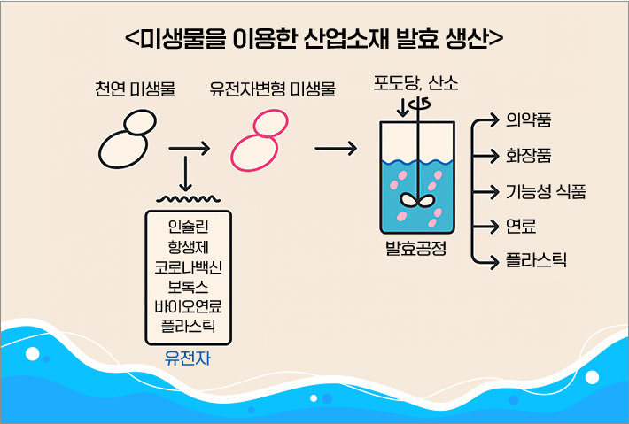 결국 페니실리움 곰팡이의 발효공정개발로 대량생산된 페니실린 항생제를 연합군에 공급하여, 상처와 병마로부터 회생한 병사를 전장으로 다시 보내서 연합군이 전쟁에서 이길 수 있었다는 유명한 스토리가 있다. 지금도 거의 모든 항생제의 원료는 미생물 발효로 생산하고 있다. 첨단 의약품의 시초라는 당뇨병 치료제 인슐린, 인간성장호르몬, 인류를 구한 코로나백신 등도 유전자 재조합기술과 미생물 발효 기술의 만남으로 생산되고 있다. 화장품 분야에서 주름 개선용 보툴리눔 톡신과 필러원료인 히알루로닉산 또한 미생물발효로 생산한다.